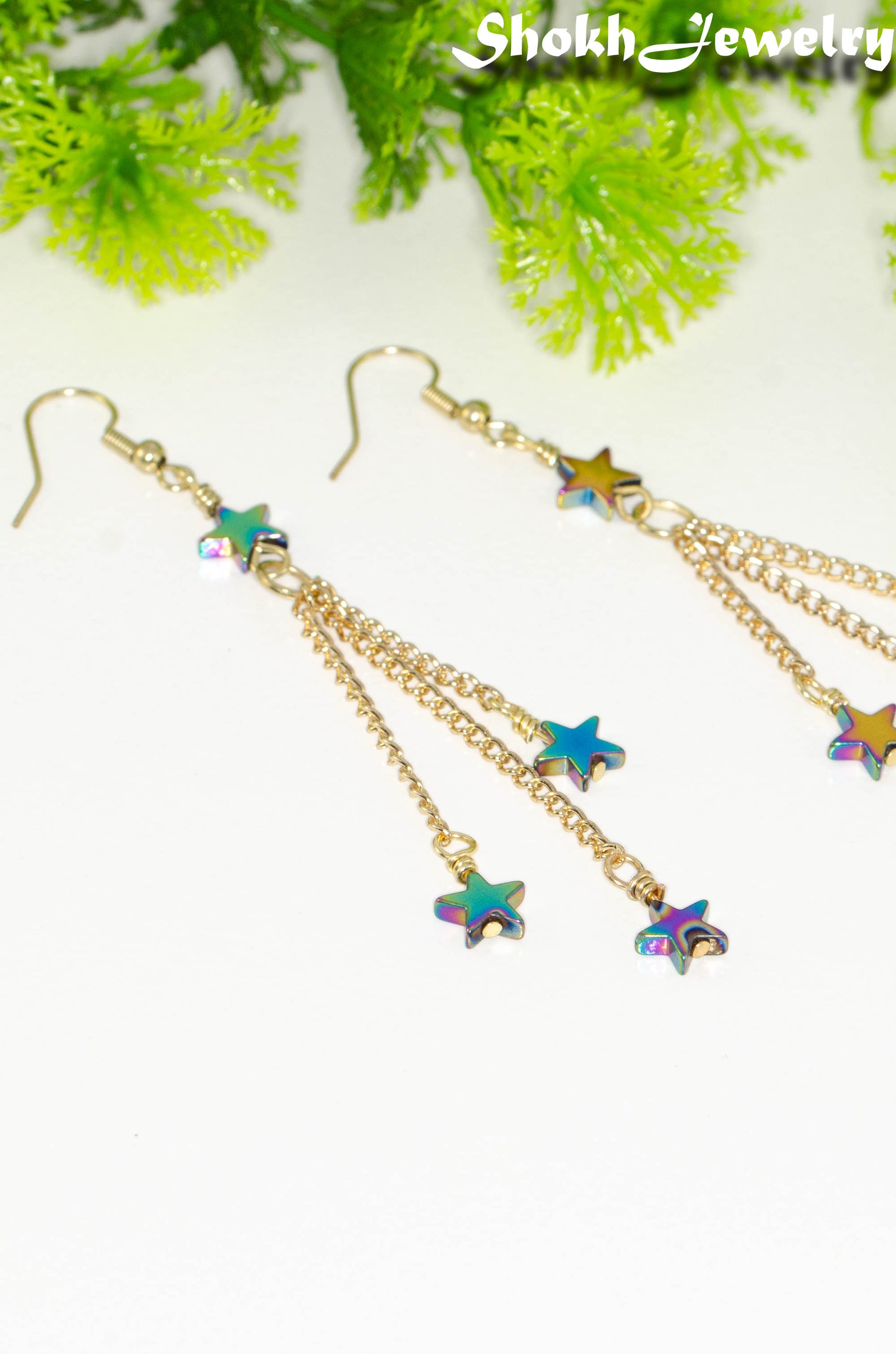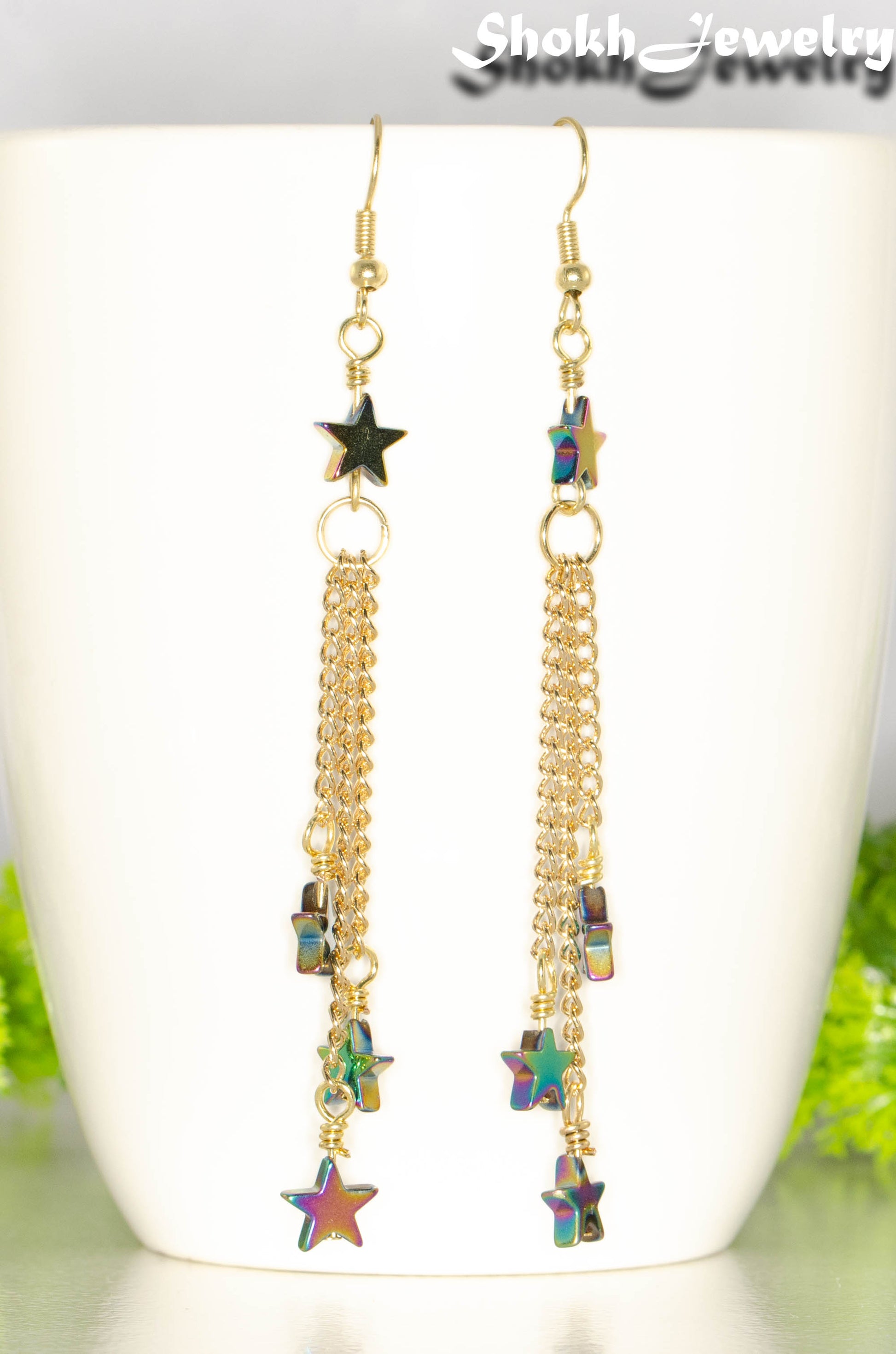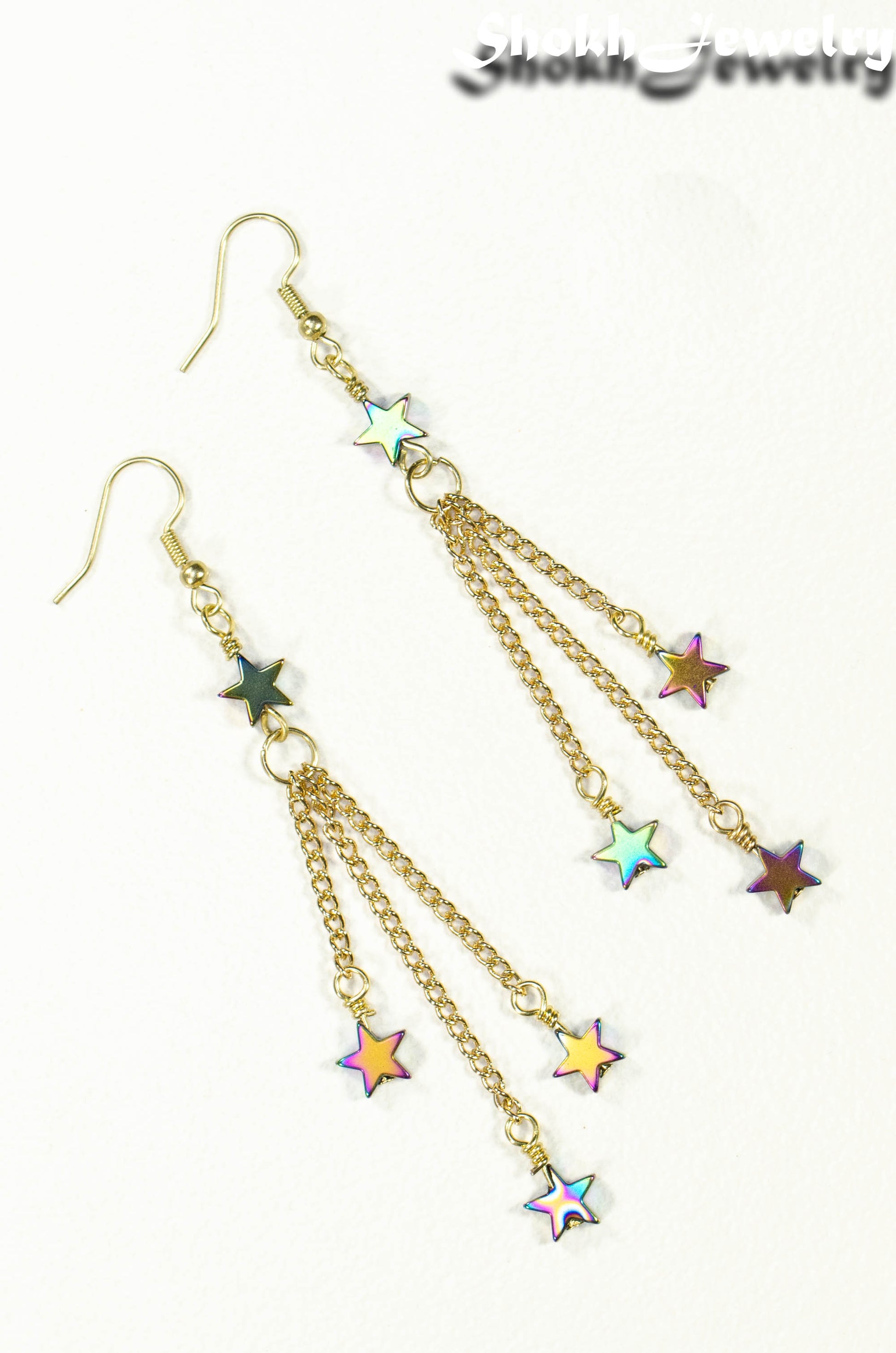 These gorgeous earrings are handmade with rainbow Hematite star beads, curb chains in gold colour and ear wires.